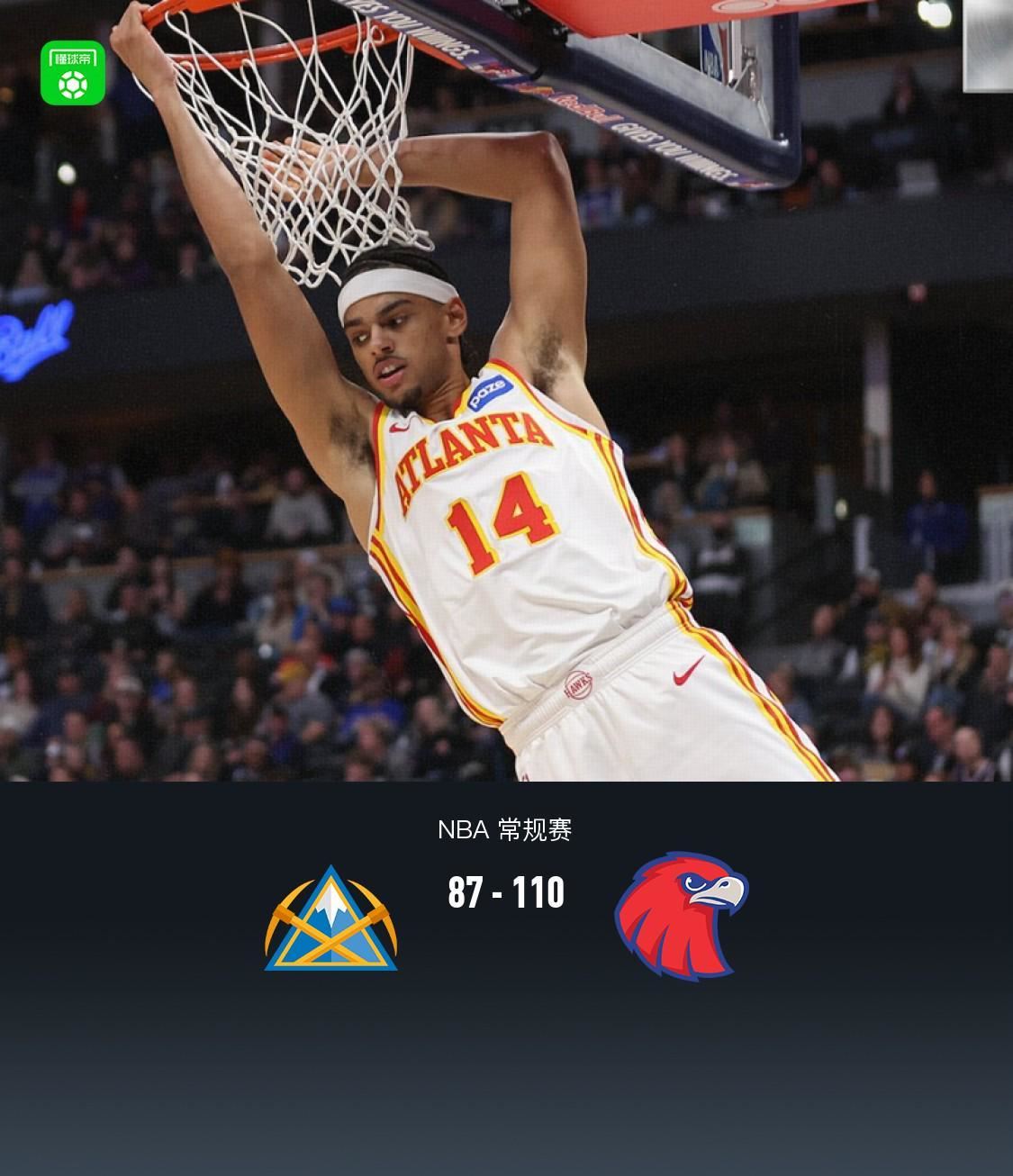 老鹰110-87大胜掘金,杰伦-约翰逊29+9+6 北京时间1月10日NBA 常规赛,丹佛掘金对阵亚特兰大老鹰。半场掘金50-58老鹰,最终掘金87-110老鹰。丹佛掘金沃特森25分11板4助,阿隆-戈登14分9板5助;亚特兰大老鹰杰伦-约翰逊29分9 2026-01-10